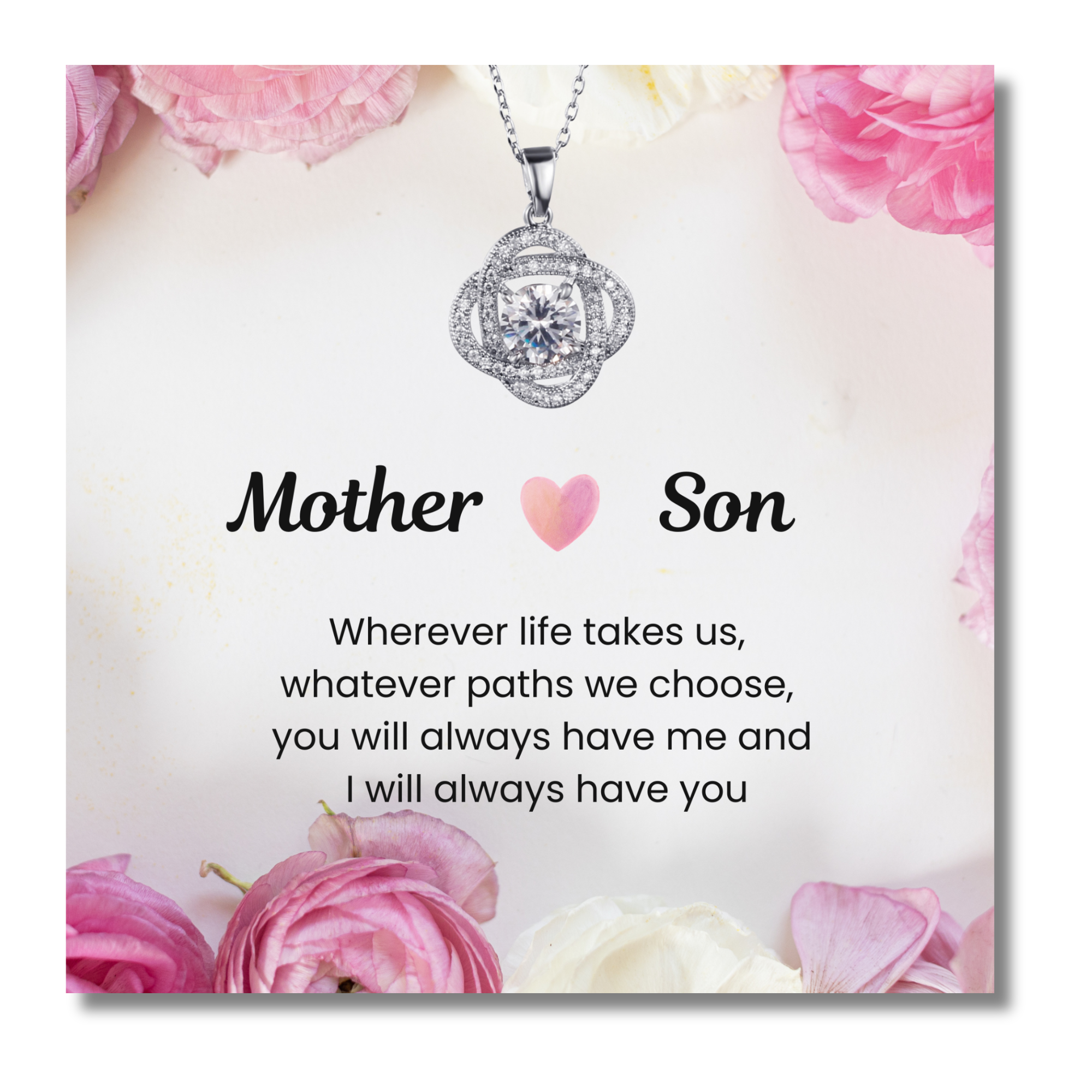 This necklace is a beautiful sentiment piece designed to celebrate the unbreakable bond between a mother and her son. Featuring an elegant interlocking love knot design, it serves as a meaningful keepsake for any occasion.