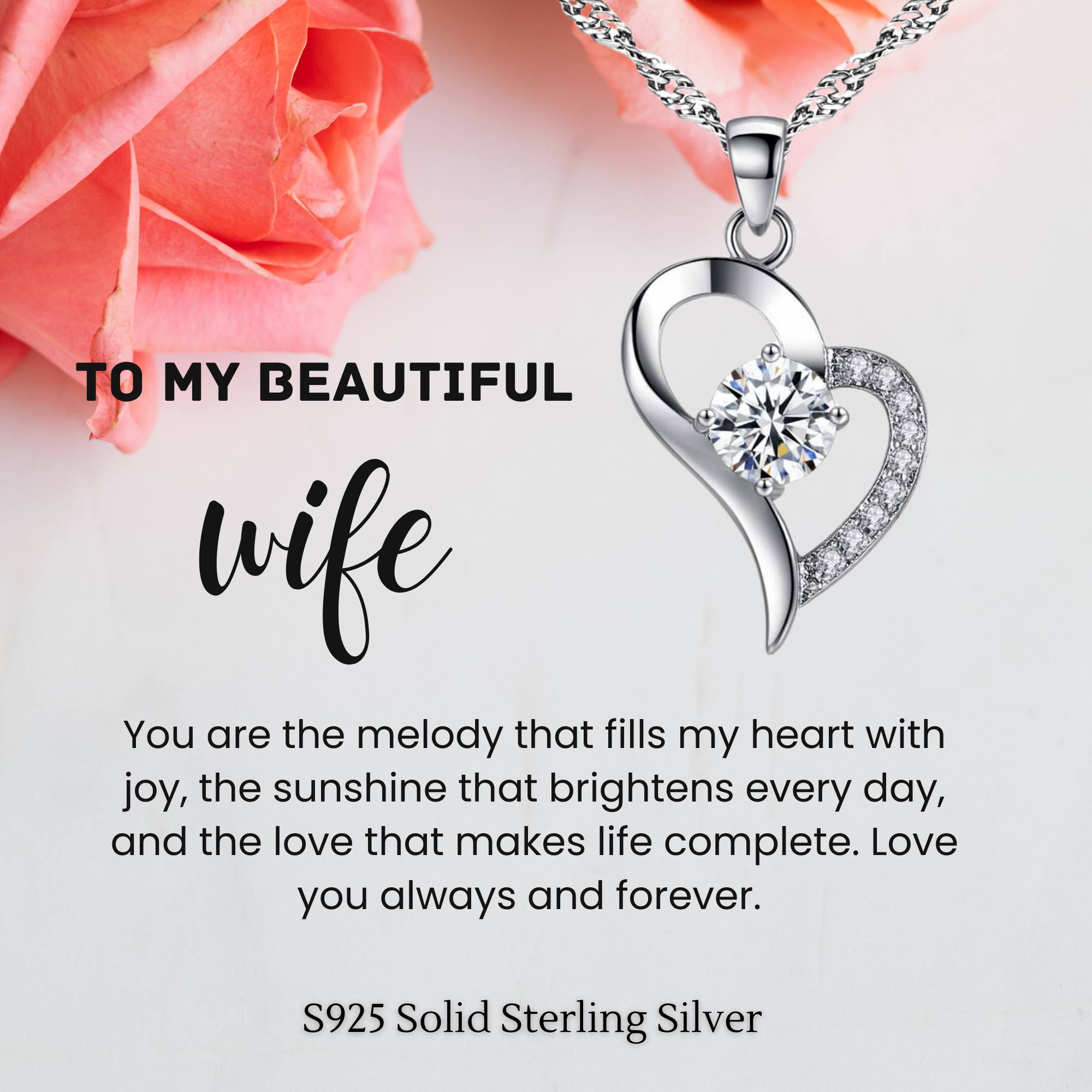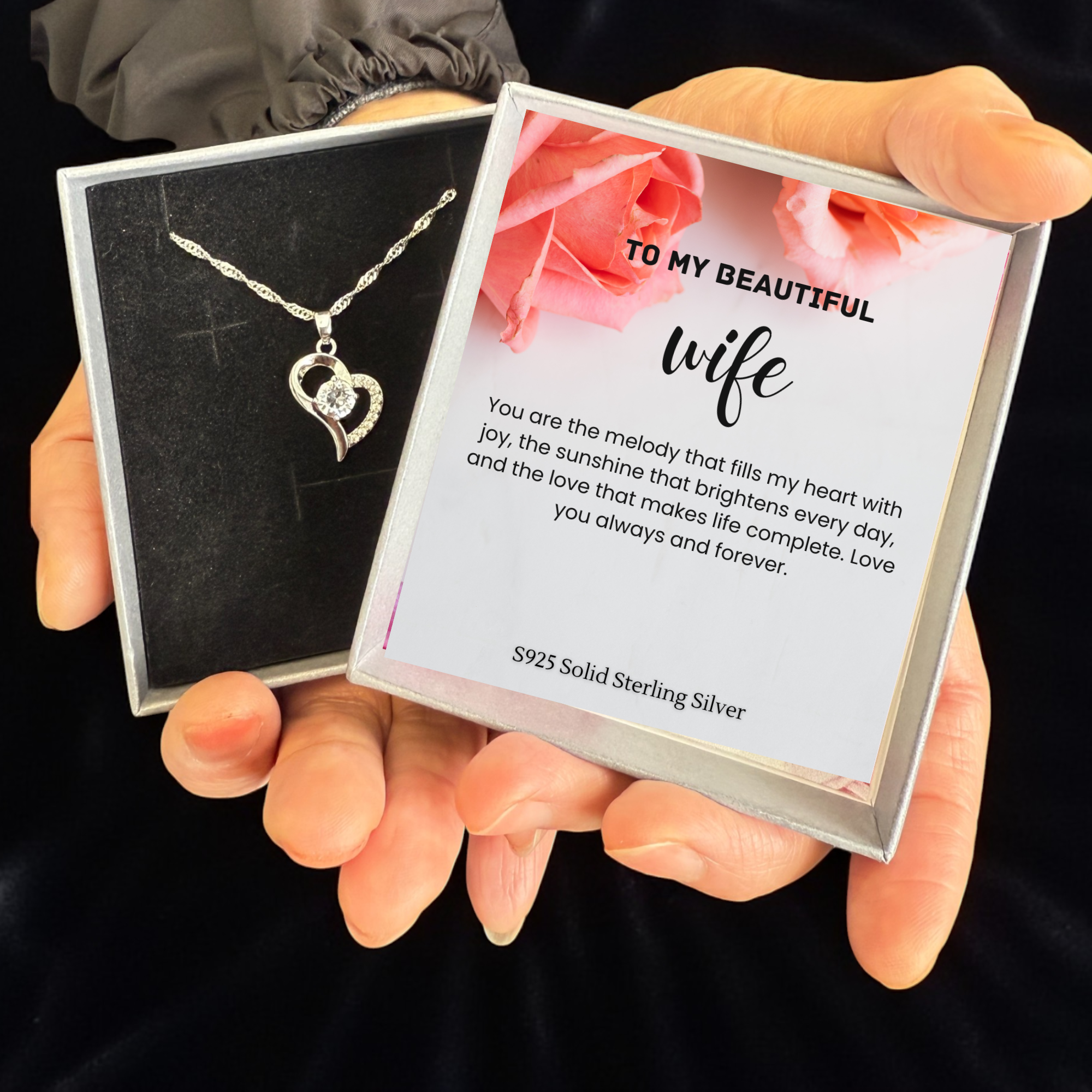 S925 Sterling Silver Heart C/Z Pendant Necklace with Message Card For Wife