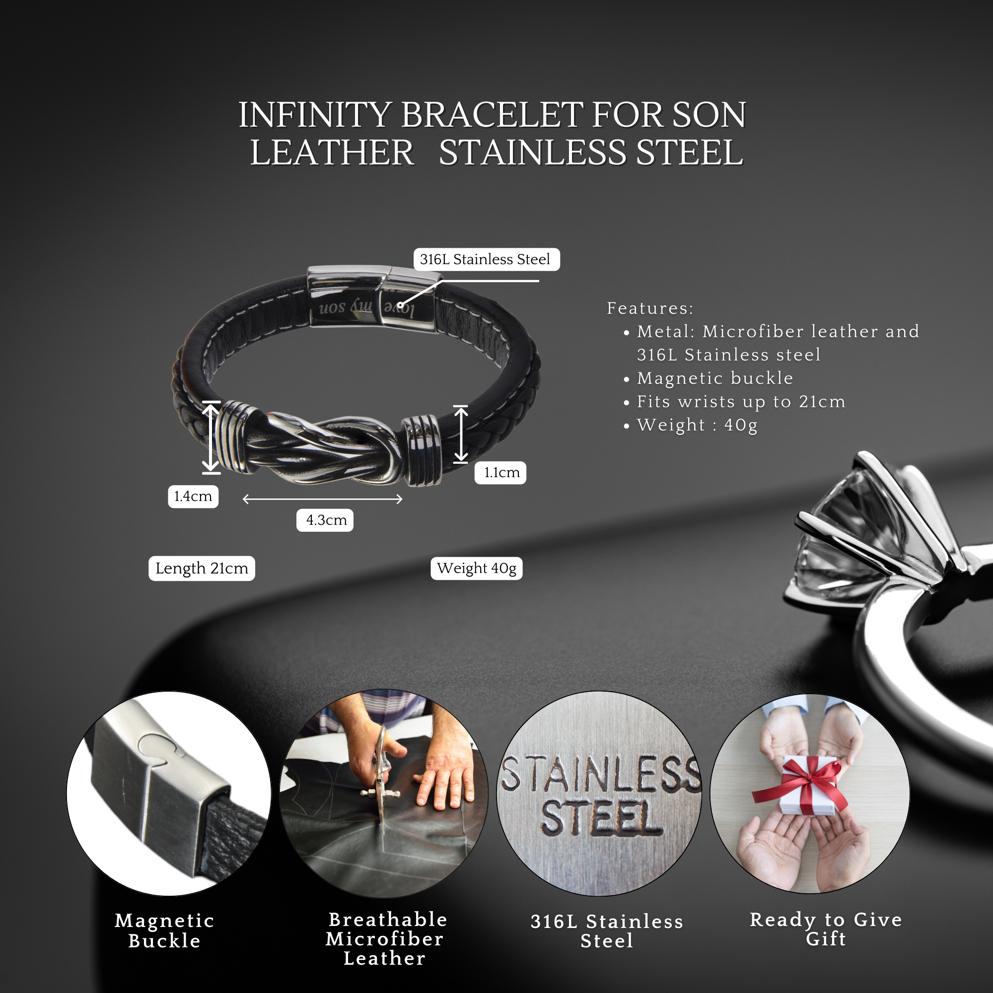 The Infinity bracelet is a powerful symbol of strength, resilience, and growth, making it the perfect gift for a son who is embarking on a new chapter in his life. This bracelet is made from Microfiber leather and features a stainless steel infinity emblem, making it a stylish and durable accessory that he can wear with pride.
