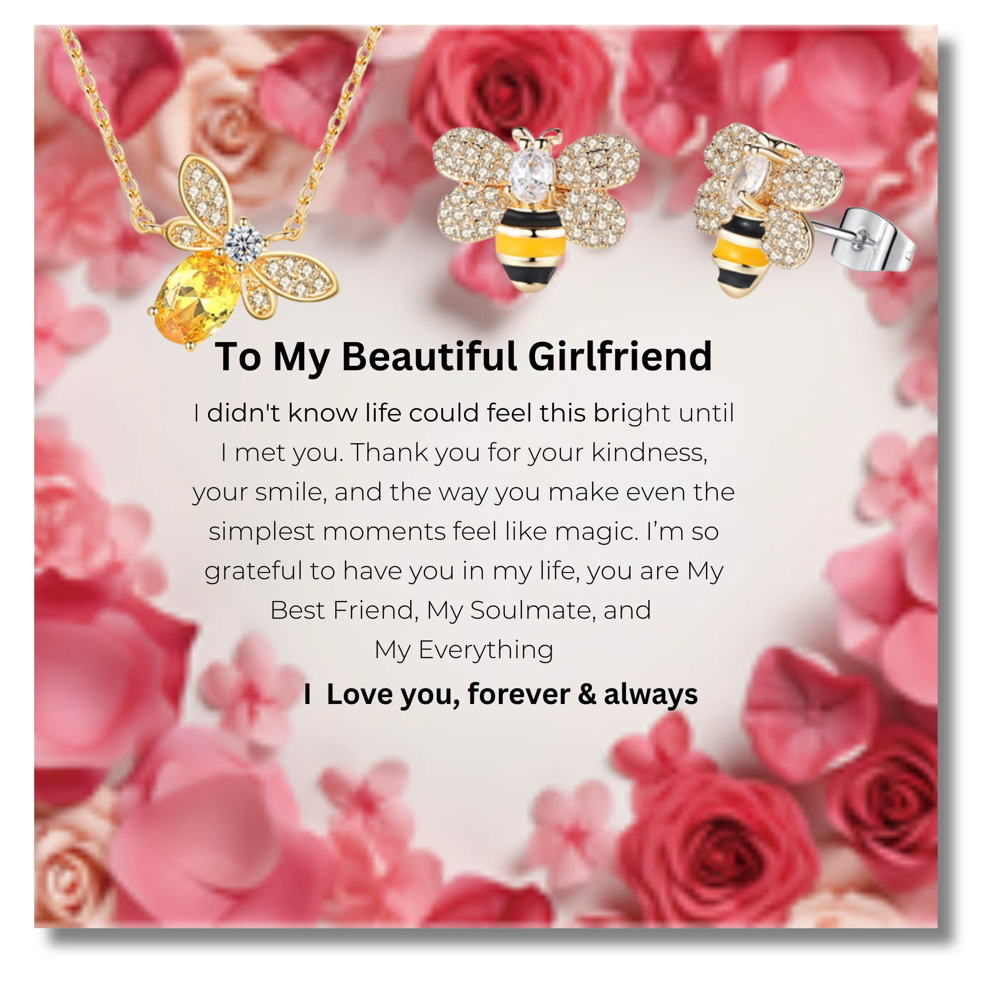 The “Bee Mine” Necklace and Earrings Jewellery Set in Gold With Message Card For Girlfriend Valentine’s Day Gift