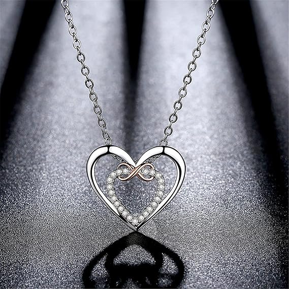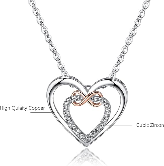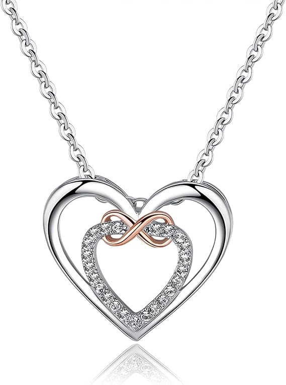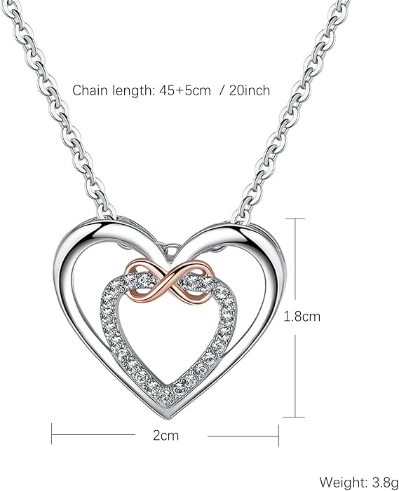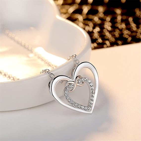 • Interlocking Heart Pendant: Features a polished silver tone outer heart cradling a smaller, crystal encrusted inner heart. A delicate rose gold-tone infinity loop connects the hearts, symbolising an everlasting connection.