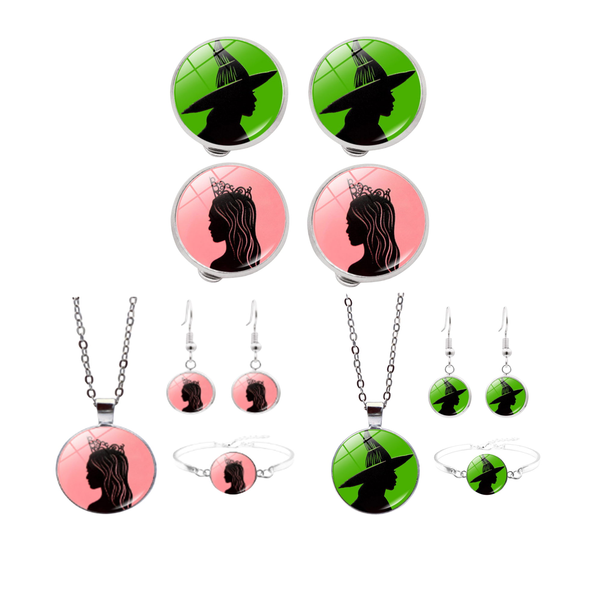 Wicked Witch Inspired Elphaba & Glinda Necklace, Earrings and Bracelet Tri Set and Pin 4PC Set